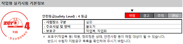 실기시험은 안전등급 4 등급의 시험으로 보호구 및 수험생 지참공구 목록을 확인하셔서 꼭 챙겨가셔야 감점을 당하지 않으니 꼭 챙겨가시길 바랍니다.