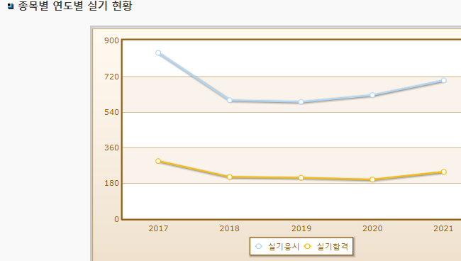 실기시험 연도별 합격륭이며 2021년 기준 실기시험 응시자수는 698명으로 그 중 합격자는 237명입니다.