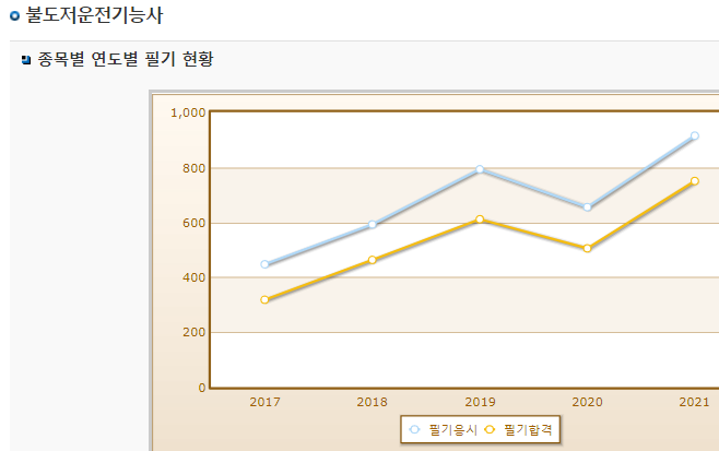 필기시험 연도별 합격률이며 2021년 기준 필기시험 응시자 수는 915명으로 그 중 합격자는 750명입니다.