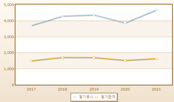 연도별 필기시험 합격률이며 2021년 기준 응시자 수는 4,672명으로 그 중 합격자는 1,633명입니다.