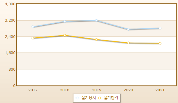 실기시험 합격률은 높은편이며 필기시험 합격률은 낮은 그런 유형의 시험입니다.