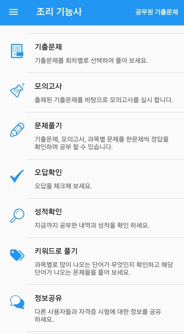 자격증 및 공무원 시험 공부를 할수 있는 기출문제앱 입니다!! 100종목 이상의 자격증 기출문제와 2007년부터 2018년 상반기까지의 공무원 시험 기출문제를 풀어 볼 수 있습니다. 1. 기출문제 기