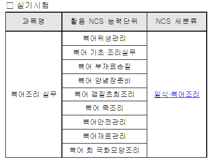필기시험과목은 복어재료관리와 음식 조리 및 위생관리입니다.