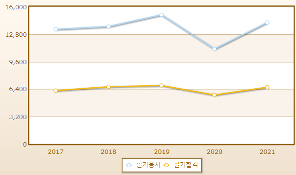 연도별 필기시험 합격률이며 2021년 기준 응시자 수는 14,169명으로 그 중 합격자는 6,615명입니다.