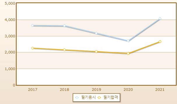 연도별 필기시험 합격률이며 2021년 기준 응시자 수는 4,058명으로 그 중 합격자는 2,652명입니다.