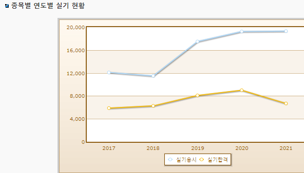 실기시험 연도별 합격률추이이며, 2021년 기준 응시자 수는 19,311명으로 그중 합격자는 6,687명입니다.