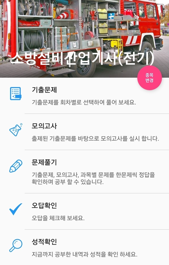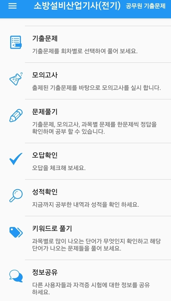 어플을 이용하여 연도별 필기 기출문제와 모의고사 여러형태의 문제 풀기, 오답 확인까지 가능한 어플입니다.