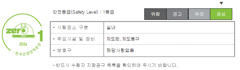 실기시험의 경우 안전등급 1등급의 시험이라 보호구 착용 해당 사항은 없습니다.