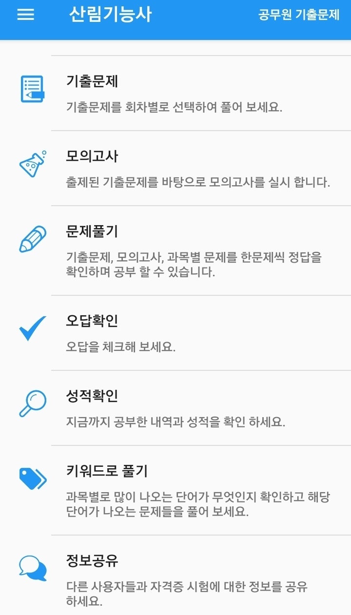 자격증 및 공무원 시험 공부를 할수 있는 기출문제앱 입니다!! 100종목 이상의 자격증 기출문제와 2007년부터 2018년 상반기까지의 공무원 시험 기출문제를 풀어 볼 수 있습니다. 1. 기출문제 기