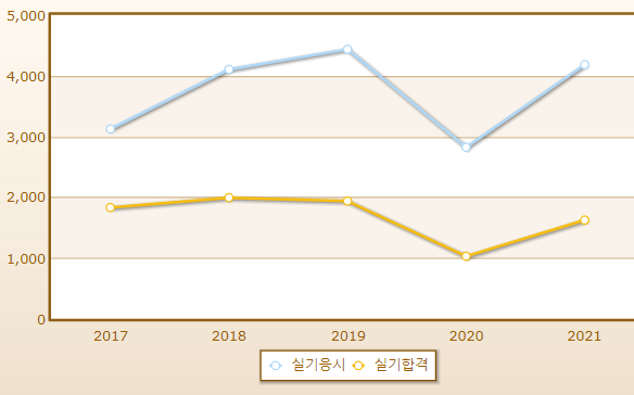도배기능사 자격증 실기시험 연도별 합격률이며 2021년 기준 응시자 수는 4,182명으로 그 중 합격자는 1,624명입니다.