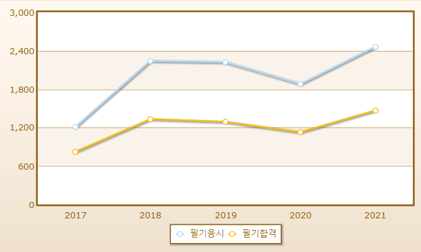 연도별 필기시험 합격률이며 2021년 기준 응시자 수는 2,459명으로 그 중 합격자는 1,466명입니다.