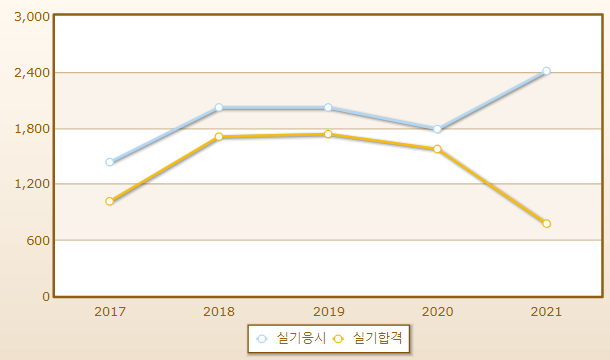 연도별 실기시험 합격률이며 2021년 기준 응시자 수는 2,409명으로 그 중 합격자는 773명입니다.