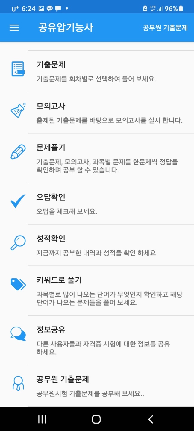 다른 곳 일일이 기출문제 찾아볼 필요 없이 이 어플을 이용하면 연도별 기출문제와 모의고사, 오답 확인이 가능하며, 자격증 준비생들과 함께 시험 정보에 대한 공유를 할 수 있습니다.