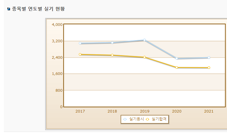 결과로 보시면 실기시험 합격률보다 필기시험의 합격률은 현저히 낮습니다. 그래서 필기시험 기출문제를 많이 풀어 대비를 철저히 해야 합니다.