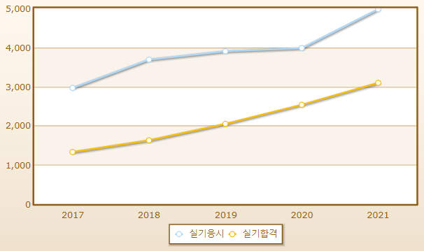 연도별 실기시험 합격률이며 2021년 기준 응시자 수는 4,975명으로 그 중 합격자는 3,093명입니다.