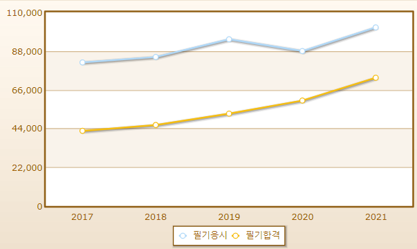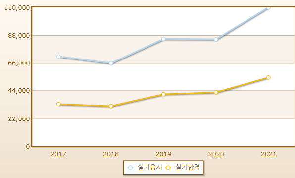 연도별 실기시험 합격률이며 2021년 기준 응시자 수는 109,940명으로 그 중 합격자는 절반정도인 54,392명입니다.
