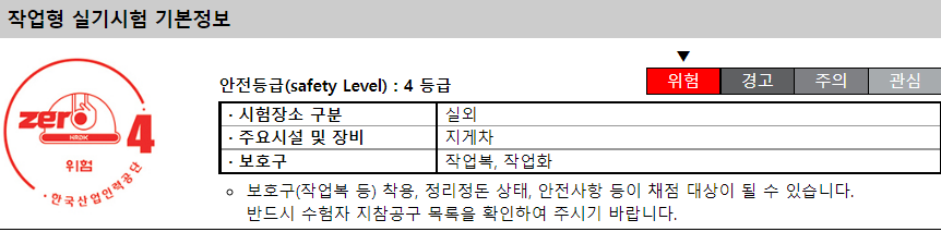 또한 지게차운전기능사 실기시험은 안전등급 4등급의 시험으로 꼭 보호구 및 작업화를 챙겨야 합니다.