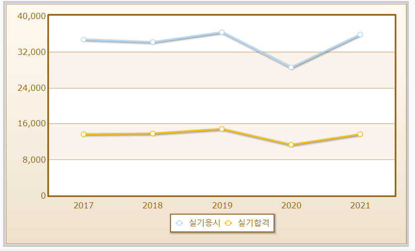 연도별 실기시험 합격률이며 2021년 기준 수험생은 35,799명으로 그 중 합격자는 13,613명입니다.