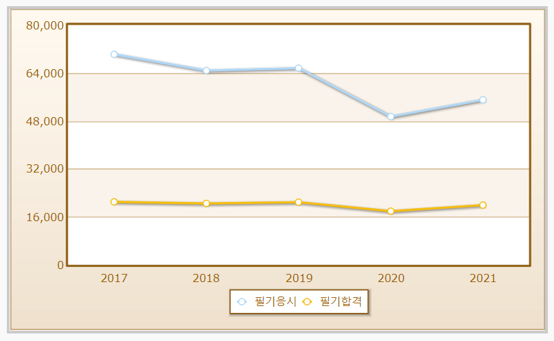 연도별 필기시험 합격률이며 2021년 기준 수험생은 55,039명으로 그 중 합격자는 19,907명입니다.