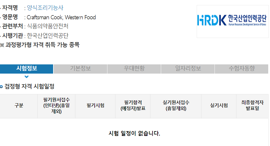 양식조리기능사 시험일정 및 시험과목