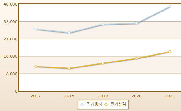양식조리기능사 연도별 필기시험 합격률이며 2021년 기준 응시자 수는 38,838명으로 그 중 합격자는 18,102명입니다.