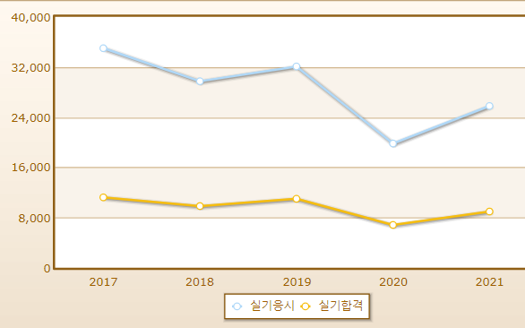 양식조리기능사 연도별 실기시험 합격률이며 2021년 기준 응시자 수는 25,783명으로 그 중 합격자는 8,960명입니다.