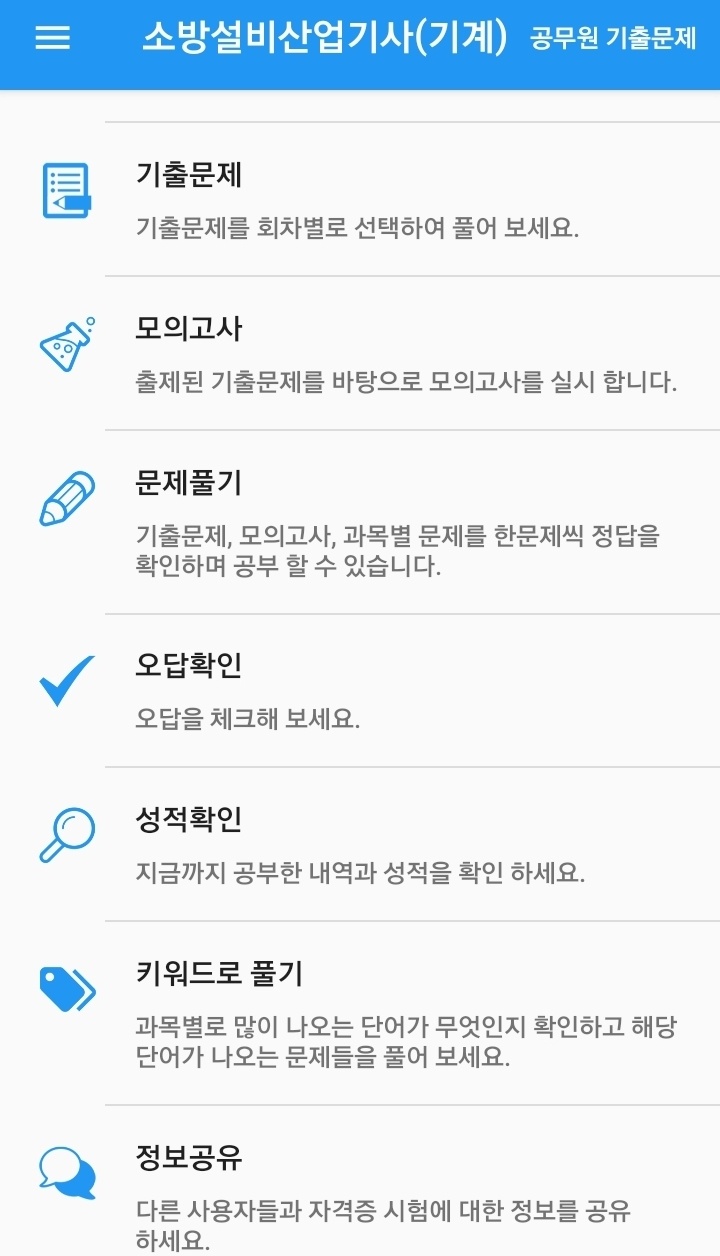 어플을 이용하여 년도별 기출문제와 모의고사 여러 유형의 문제풀기가 가능하며, 오답확인도 가능합니다.