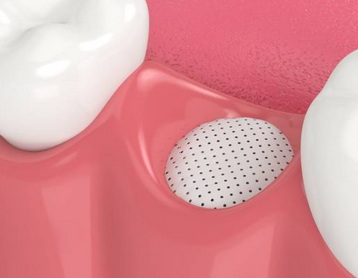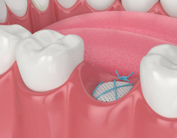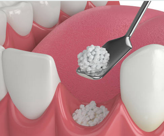 2. 잇몸뼈의 양이 부족하거나 약한 경우에는 뼈이식을 합니다. 인공뼈를 채워 넣고 막을 덮은 후 봉합합니다. 뼈이식은 임플란트 식립 전이나 후에 할 수 있습니다.