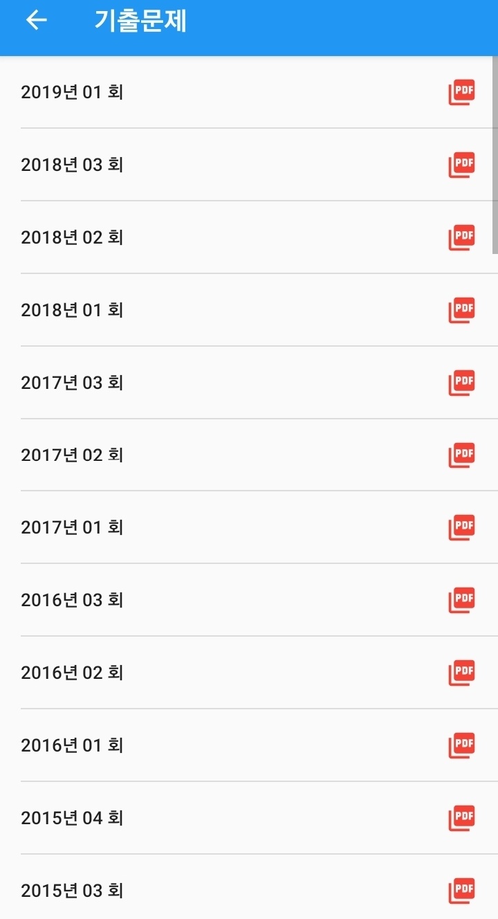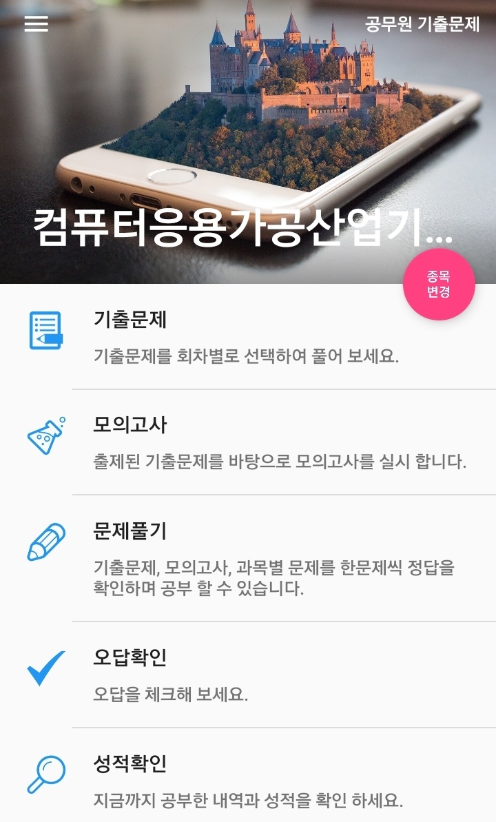 위 어플을 이용하여 연도별 필기 기출문제와 모의고사 등 여러 유형의 문제를 풀 수 있습니다.