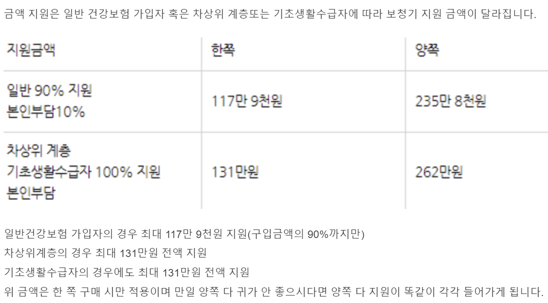 - 보청기 1개당 최대 80만원까지 지원 (단, 5년 이내 재구매 시에는 40만원까지 지원)