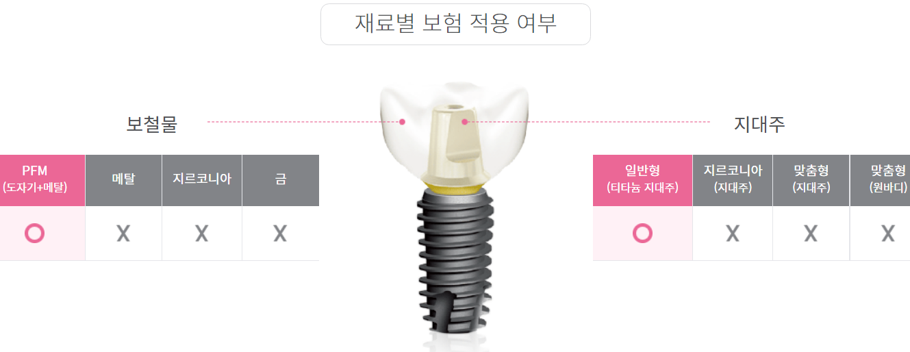 A. 안됩니다. 보철재료를 금이나 메탈,PFG,지르코니아 등으로 치과 임플란트를 시술하는 경우에는 보험적용이 되지 않습니다.