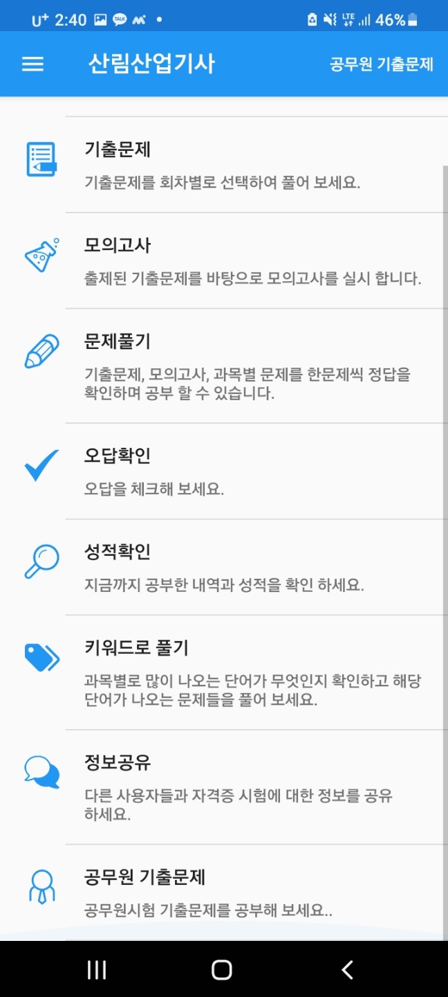 어플을 이용하여 연도별 기출문제와 모의고사, 오답확인 가능한 어플이 있습니다. 또 시험 준비생들과 시험에 대한 정보공유도 가능합니다.