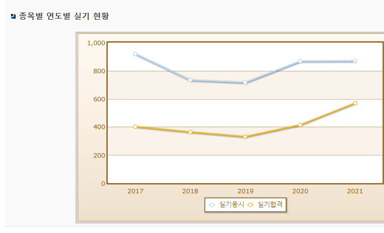 연도별 실기시험 합격률 추이이며, 2021년 기준 실기시험의 경우 응시자 수는 869명으로 그 중 합격자는 570명입니다.