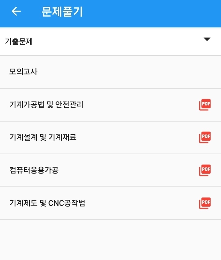위 어플을 이용하여 연도별 필기 기출문제와 모의고사 등 여러 유형의 문제를 풀 수 있습니다.