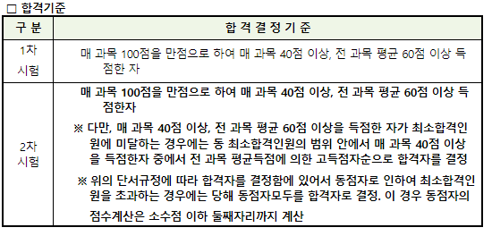 합격기준은 1차 시험의 경우 매 과목 100점 만점으로 하여 매 과목 40점 이상, 전 과목 평균 60점 이상 득점하셔야 하며 2차 시험의 경우 매 과목 100점을 만점으로 하여 매 과목 40점 이상, 전 과목 평균 60점 이상 득점하여야 합니다.