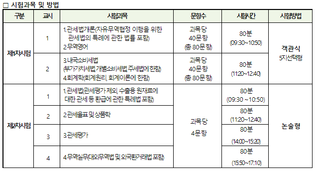 제2차 시험의 경우 총 4교시로 나누어져 있으며 관세법, 관세율표 및 상품학, 관세평가, 무역실무로 구성되어있습니다. 각 과목당 4문항이 출제되며 논술 형식으로 진행되고 각 과목당 80분으로 총 320분이 소요됩니다.