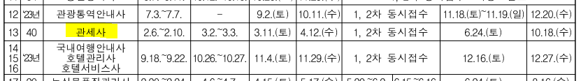 위 이미지는 2023년 관세사 시험 일정입니다. 수험자의 시험 준비 등을 위하여 조기 확정한 것으로 최종 시행 일정, 지역 등 자격 관련 상세내역은 자격별 시행계획 공고문을 반드시 확인하시기 바랍니다.