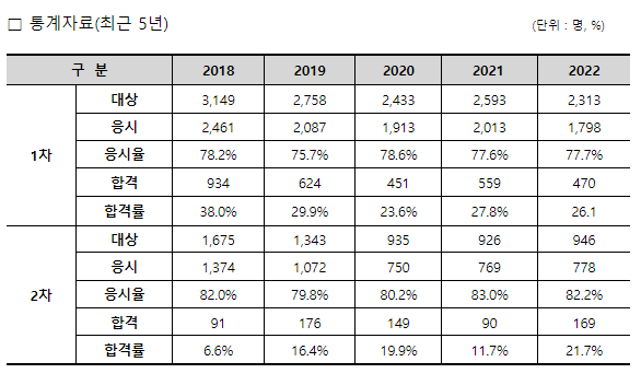 위 이미지는 관세사의 최근 5년간 시험별 합격 통계자료입니다. 1,2차 모두 높은 합격률을 보이고 있으며 누구나 열심히 준비하신다면 충분히 합격하실 수 있습니다.
