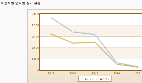 연도별 실기시험 합격률이며, 2021년 기준 실기시험 응시자 수는 577명으로 그중 합격자는 496명입니다.