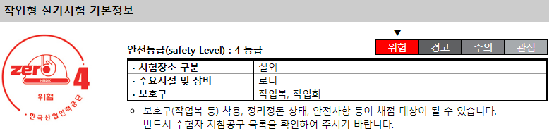 로더 운전기능사 실기시험은 안전등급 4등급에 해당하는 시험으로 보호구 착용 및 수험생 지참공구 목록을 확인해 챙겨가야 감점을 받지 않을 수 있으니 꼭 챙겨가셔야 합니다.