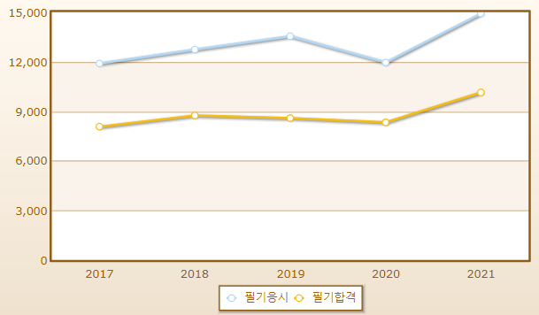 연도별 필기시험 합격률이며 2021년 기준 응시자 수는 14,918명으로 그 중 합격자는 10,141명입니다.