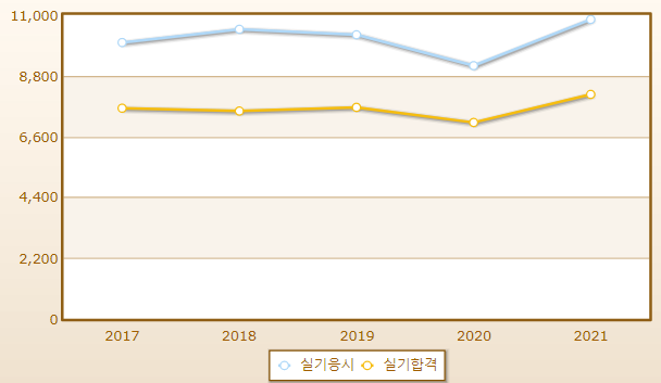 연도별 실기시험 합격률이며 2021년 기준 응시자 수는 10,836명으로 그 중 합격자는 8,122명입니다.