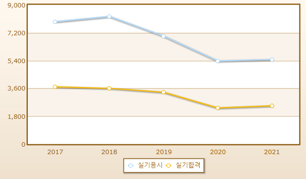연도별 실기시험 합격률이며 2021년 기준 응시자 수는 5,464명으로 그 중 합격자는 2,475명입니다.