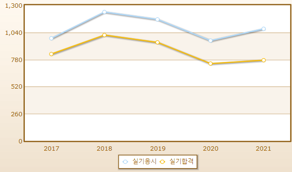 연도별 실기시험 합격률이며 2021년 기준 응시자 수는 1,074명으로 그 중 합격자는 773명입니다.