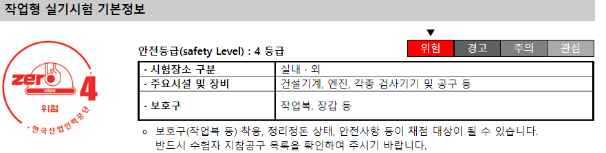 실기시험은 안전등급 4등급의 시험으로 꼭 보호구 및 수험생 지참공구 목록을 확인하여 챙겨가야 하며 챙기지 않을 시 감점 요인이 되니 잘 챙겨가시길 바랍니다.